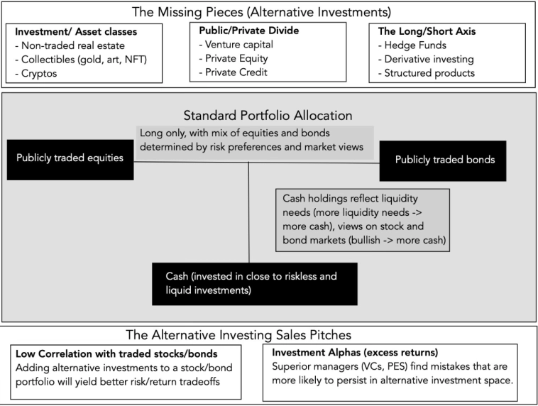 Эта схема позволяет выбирать различные варианты, от чисто механических (например, широко разрекламированное сочетание 60% акций/40% облигаций) до более гибких, когда распределение может меняться во времени и зависеть от рыночных условий. Эта общая схема допускает варианты, включая различные взгляды на рынки (от тех, кто считает, что рынки эффективны, до любителей выбирать акции и рыночных таймеров), а также инвесторов с совершенно разными временными горизонтами и уровнями риска. Тем не менее, очевидно, что существуют большие сегменты инвестирования, которые остаются за рамками этого микса: от частных предприятий (поскольку они не котируются и не торгуются) до коротких продаж (когда вы можете иметь отрицательный вес портфеля не только по отдельным инвестициям, но и по целым рынкам) и классов активов, которые не торгуются. На самом деле, лучший способ структурировать вселенную альтернативного инвестирования - это посмотреть на альтернативы через призму этих недостающих частей.