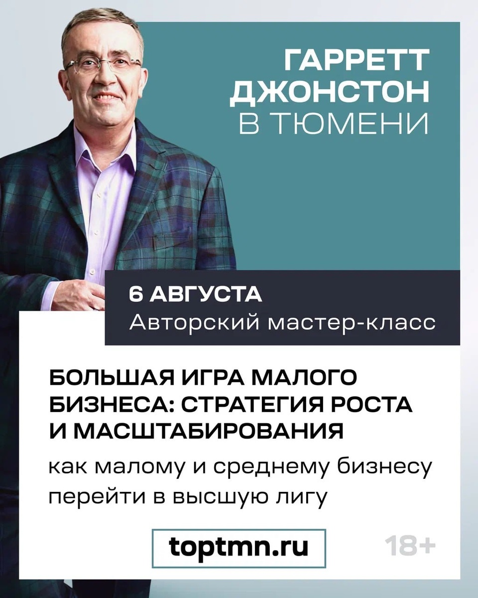 💬 Международный бизнес-стратег и эксперт в области маркетинга Гарретт Джонстон снова выступит в Тюмени. 6 августа топ-спикер проведет авторский мастер-класс «Большая игра малого бизнеса: стратегия роста и масштабирования». Участники узнают, как завоевать любовь клиентов и каких людей брать на работу. 💬 В программе: 🔹прорывы, провалы и уроки для малого и среднего бизнеса 🔹стратегии самых успешных бизнесменов на планете 🔹чек-лист для серьезной стратегии роста бизнеса 💪 6 августа с 10:00 до 18:00 в DoubleTree by Hillton, ул. Орджоникидзе, 46 Купить билет можно на сайте: toptmn.ru Доступна опция оплаты по счету. Дополнительная информация: на сайте toptmn.ru и по телефонам: +79199513666, +79324898872
