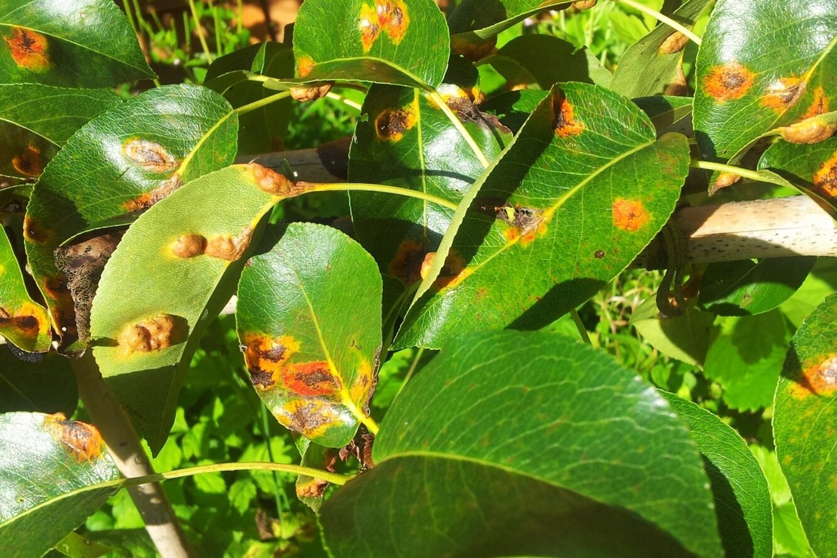 Ржавчина груши – болезнь внезапная. Сначала ее никак не видно, а потом резко все зеленые листья становятся больными. Если дерево при симптоматике не лечить, то оно из года в год будет поражаться болезнью, пока не усохнет полностью. Урожай, снятый с него, храниться будет плохо, а то и вовсе начнет портиться еще до уборки. Симптомы заражения груши ржавчиной сложно спутать с чем-то иным. На листьях четко видны очаги грибковых спор, они выглядят как ярко-огненные островки, выпуклые и шероховатые на ощупь. При осмотре обратных сторон пластин, визуализируются конусовидные опушенные наросты. Пример я покажу на фото. Именно по обратной стороне пластин проще всего подтвердить\опровергнуть диагноз. Если все верно и у Вас на участке активизировалась ржавчина груши, то следует поискать ее настоящего хозяина. Дело в том, что данный грибок не так прост, он не может обходиться одной лишь грушей, ему необходим еще один кормилец. Обычно это можжевельники, которые в зимнее время года являются приста