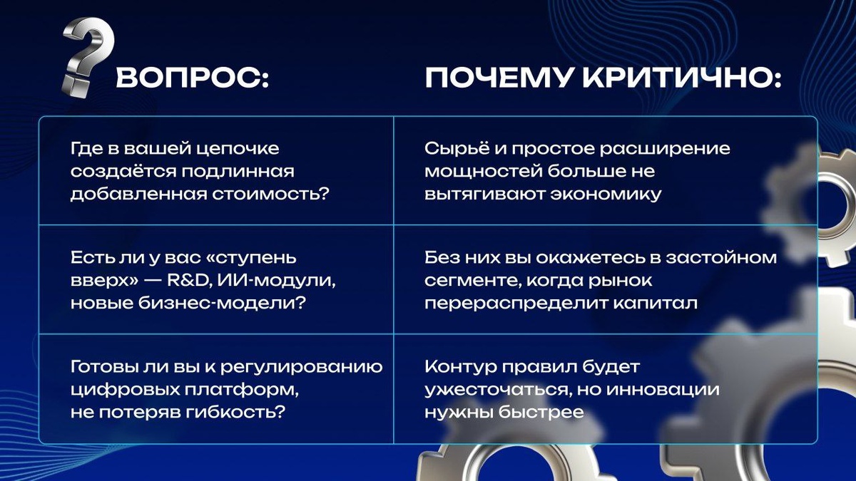 🚀 Экономика РФ: Шаг не вперёд, а вверх! Максим Орешкин заявил о необходимости перехода к новой модели роста, где ставка делается на технологический и организационный скачок. Ресурс "простых решений" исчерпан. 🗝 Платформизация: Развитие маркетплейсов и цифровых экосистем - драйвер роста. Важно не задушить его избыточным регулированием. Технологическая перестройка: Автоматизация, ИИ, глубокая переработка сырья, новые производственные цепочки - в приоритете. Новая архитектура отраслей: Переход от "широких" госпрограмм к точечным инициативам с фокусом на скорость обновления продуктов. 📌Что это значит для вашего бизнеса? Где в вашей цепочке создаётся подлинная добавленная стоимость? Есть ли у вас "ступень вверх" в виде R&D, ИИ-модулей, новых бизнес-моделей? Готовы ли вы к регулированию цифровых платформ, не теряя гибкость? ✔️ Пора совершать следующие шаги для компаний: Аудит роста: Определите "экстенсивные" факторы роста и спланируйте новый источник продуктивности. Инвентарь