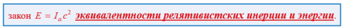 2. Доказано, что отношению E /c² соответствует не релятивистская «масса», а релятивистская инерция I. Поэтому мы получаем, что E /c² = I, а уже отсюда вытекает формула E = Iₐc² эквивалентности релятивистских энергии и инерции. В последней формуле мы использовали при знаке энергии нижний индекс α, потому что внешняя сила, воздействующая на релятивистски движущееся тело, может воздействовать на него под любым углом α относительно его (тела) направления движения.