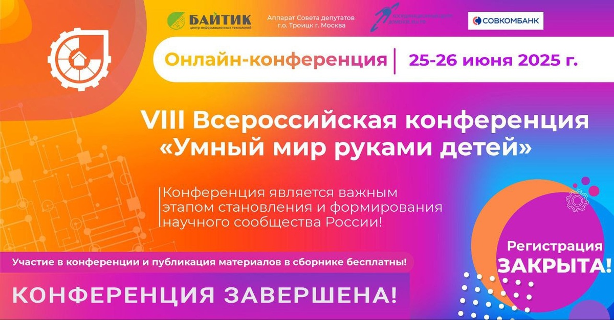 #Конференция 🔔 Работа конференции завершена 🌟 Поздравляем всех участников, научных руководителей и экспертов с завершением работы VIII Всероссийской конференции "Умный мир руками детей". 🏆 Итоги конференции: 🚩150 участников 🚩77 докладов, представленных очно в секциях 🚩86 публикаций в Сборнике тезисов материалов конференции "Умный мир руками детей" (2025 г.) 🚩55 экспертов, оценивающих проекты в разных секциях 🚩20 регионов приняло участие в конференции 🇷🇺 Благодаря ВАМ, дорогие наши участники, мы с гордостью можем сказать: у России великое будущее❗ 🤝Оргкомитет Всероссийской конференции "Умный мир руками детей" выражает благодарность за помощь в организации и проведении конференции Аппарат Совета депутатов г.о. Троицк, Координационный центр доменов .RU/.РФ, Совкомбанк. Организатор конференции: Детский IT-технопарк "БАЙТИК" Троицк Москва 👉 Подробнее на Сайте конференции
