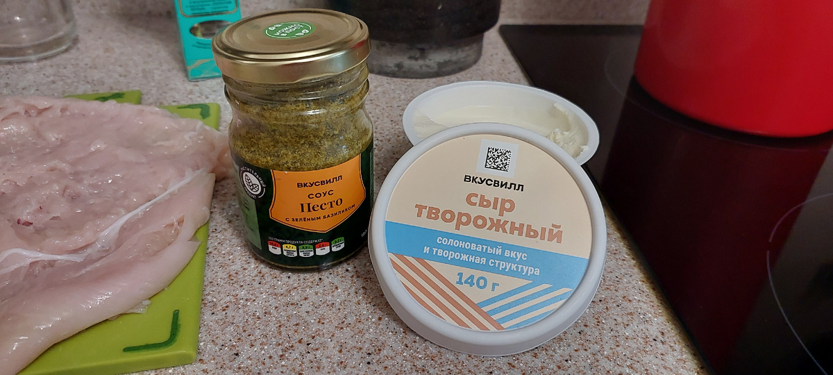 Я куриную грудку не слишком жалую. Сухая она для меня в любом виде. Но есть пара вариантов когда она более-менее съедается. И один из них- рулетики с грушами, творожным сыром и соусом песто. Потом такой рулетик порезать по возможности тоньше и положить на подсушеный в тостере хлеб - для утреннего кофе отличный вариант - ароматно, сытно, вкусно. Как в горячем, так и в холодном виде. Понадобится: 2 филе с грудки 1 большая груша 120 г творожного сыра 80 г соуса песто зелень, соль, перец и другие специи по вкусу. Творожный сыр и соус песто покупала во ВкусВилле. Грушу порезать на маленькие пластинки. Филе разрезать вдоль пополам и хорошо отбить. Натереть солью с перцем, оставить минут на 15-20.. Я еще добавила сычуаньский перец. Он хорошо сочетается с курицей. На подготовленную грудку выложить слоями соус песто, творожный сыр и грушу. Свернуть рулетом и запечь в духовке минут 40-45 при 180. Выделившимся соком можно периодически поливать грудки сверху. Я не поливала, а чтобы не по