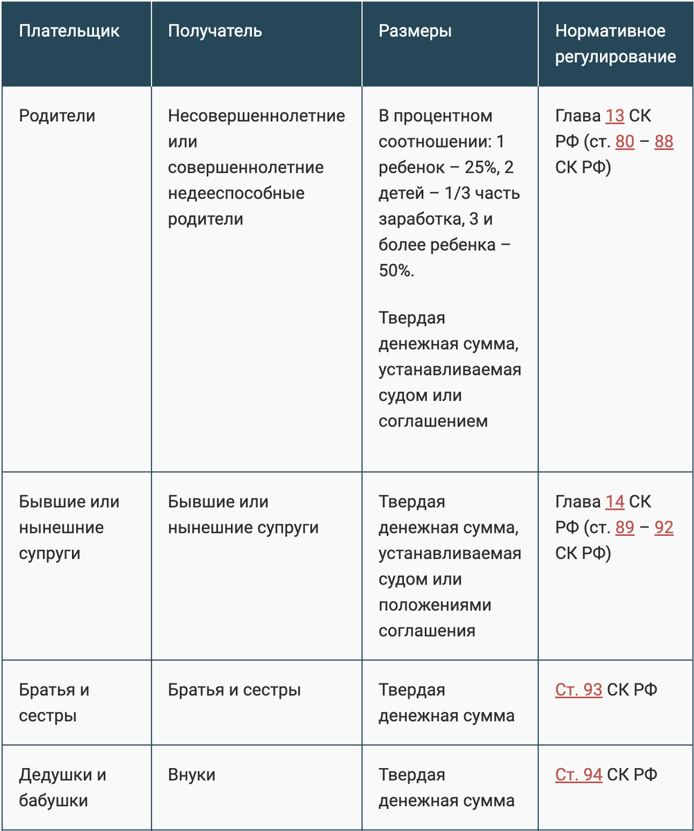 Нормы СК РФ предусматривают возможность выплаты алиментов различным категориям родственников. Для того, чтобы сложить полноценное представление о сущности обязательств, можно обратиться к таблице ниже.