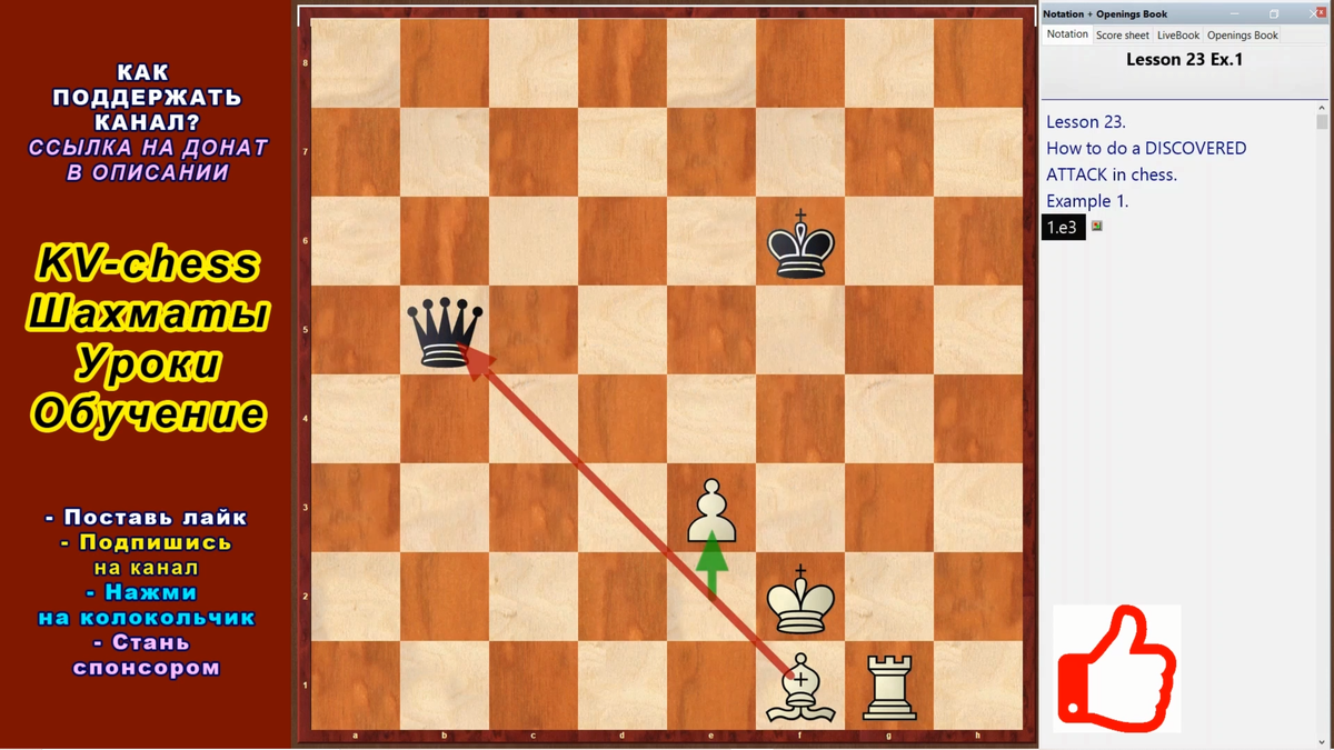 В этом уроке мы с вами разберем тему: Открытым нападением называется тактический прием, когда при каком-либо ходе открывается линия действия другой фигуры того же лагеря — ферзя, ладьи или слона, и эта вторая фигура угрожает неприятельской. Плейлист со всеми уроками для начинающих: https://dzen.ru/suite/1c93efae-1579-45ca-8c68-4b9c4da291d2 Видео по этому Уроку - внизу. В позиции ниже ход белых. После хода 1. е3 открывается линия действия слона f1, который нападает на ферзя. Это и есть открытое нападение. Открытое нападение более эффективно, если отходящая фигура совершает взятие, создает угрозу взятия, объявляет шах или угрожает матом. Давайте посмотрим. Белые играют 1.Сxa7, угрожая поставить мат ходом ладья b8 и нападая ладьей e1 на ферзя e7. Спасаясь от мата, черные вынуждены сыграть Фxe1+, и после 2.Лxe1, материальное преимущество уже у белых. В следующем примере пешка d4 находится без защиты. Однако брать ее нельзя. Если черные побьют пешку, ферзь бьет на d4, то последует слон b5 в