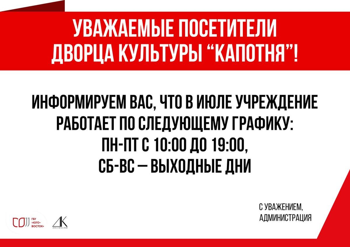 Уважаемые посетители Дворца культуры "Капотня"! Информируем вас о графике работы учреждения в июле. Мы работаем: 📅 пн-пт с 10:00 до 19:00 🎈 сб-вс — выходные дни Будьте внимательны при планировании своего досуга ☺️ Ждем вас во Дворце культуры "Капотня" согласно новому графику работы 📅 #дккапотня #культура #московскиекультурныецентры #ялюблюмоскву #вместескультурой