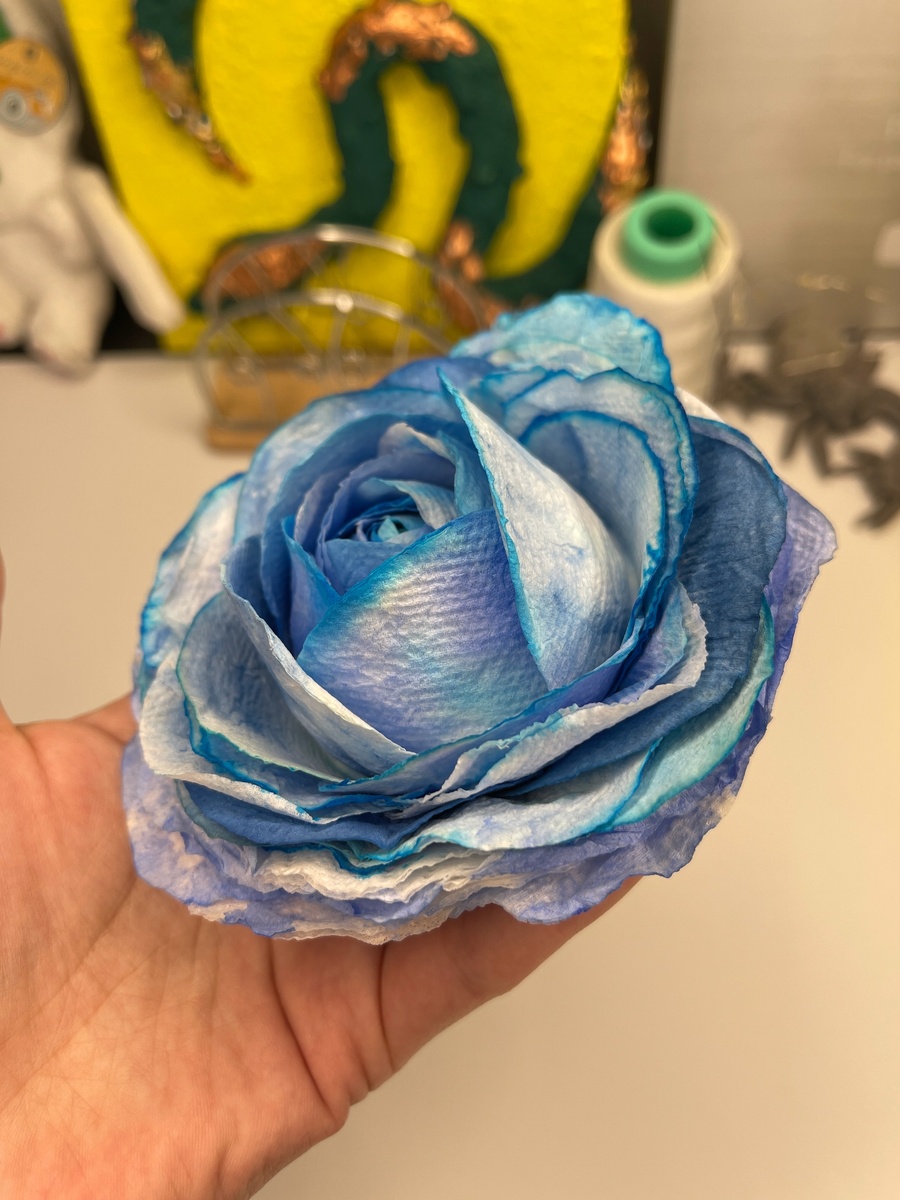 Простая, бюджетная идея для вашего дома. Что нам нужно? Стакан обычный, салфетки былые, ватные диски, клей ПВА, краска любая, ножницы и пожалуй все на этом. Первым делом давайте сделаем розу из бумаги, а после попробуем из ватных дисков. Я вырезала из салфеток овалы и кружочки. Покрасила их акварельной краской. Отлично, теперь их можно аккуратно выложить на стакан по очереди. Обязательно склеивая клеем ПВА. Должно получится, как-то так: Оставляем нашу розу просушиться на сутки и аккуратно снимаем со стакана. Получается нежная и очень красивая голубая лунная роза. С ватными дисками система такая же. Только, что не нужно вырезать они уже сразу имеют нужную нам форму.т Покрасили диски и начинаем их выкладывать на стакан по очереди. Незабываем добавить клея ПВа. И конечно не забываем оставить просушиться так же на сутки, а может и дольше. С учётом того, что ватные диски более толстые, чем салфетки. Смотрим что у нас получается, кажется, уже красиво. Готово. Любуемся результатом,
