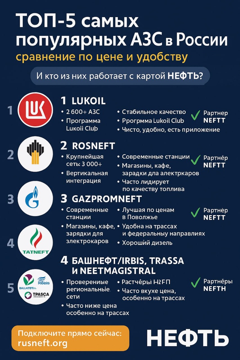 📊 ТОП-5 самых популярных АЗС в России: сравнение по цене и удобству И кто из них работает с картой “НЕФТЬ” ⛽️💳 Заправка — это уже не просто "залил и поехал". Сегодня водитель выбирает не только по цене — но и по кофе, туалету, наличию вайфая, приложению и даже… вежливости кассира. Представляем 5 самых популярных АЗС в России по мнению автомобилистов, и рассказываем, где вы можете заправиться с топливной картой "НЕФТЬ". 🥇 ЛУКОЙЛ 📍 2 600+ АЗС по стране 💡 Плюсы: стабильное топливо, бонусная система, чистые станции 📱 Приложение: работает стабильно ✅ Партнёр «НЕФТЬ» — да 🥈 РОСНЕФТЬ 📍 Самая большая сеть — 3 000+ АЗС 🛠 Надёжное качество + развитая логистика 💳 Есть кэшбэк, баллы, акции ✅ Партнёр «НЕФТЬ» — да 🥉 ГАЗПРОМНЕФТЬ 📍 Новые и стильные заправки ☕️ Часто есть кафе и комфортные туалеты 📲 Своё приложение, бонусы, онлайн-оплата ✅ Партнёр «НЕФТЬ» — да 🏅 ТАТНЕФТЬ 📍 Особенно сильна в Поволжье и Татарстане 🟢 Одни из лучших цен на трассах 🛢 Подходит тем, кто ище