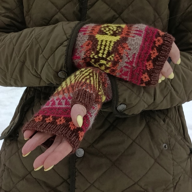 Возможно, кому-то в этом году повезло. Это не я. Я про погоду. У нас на Ленинградчине сплошные дожди, температура +20 - это уже кажется прям тепло. В огороде не растет ничего, только трава прет. И в этих условиях перчатки кажутся совсем не лишними. Митенки так уж точно. А их есть у меня. Техника жаккард, а именно фейр айл. Цвета возможны в принципе любые, в том числе можно ограничиться двумя. А можно наоборот истратить остатки. Это был рассказ об изделии, описание которого опубликовано в канале Мастер-класс по понедельникам
