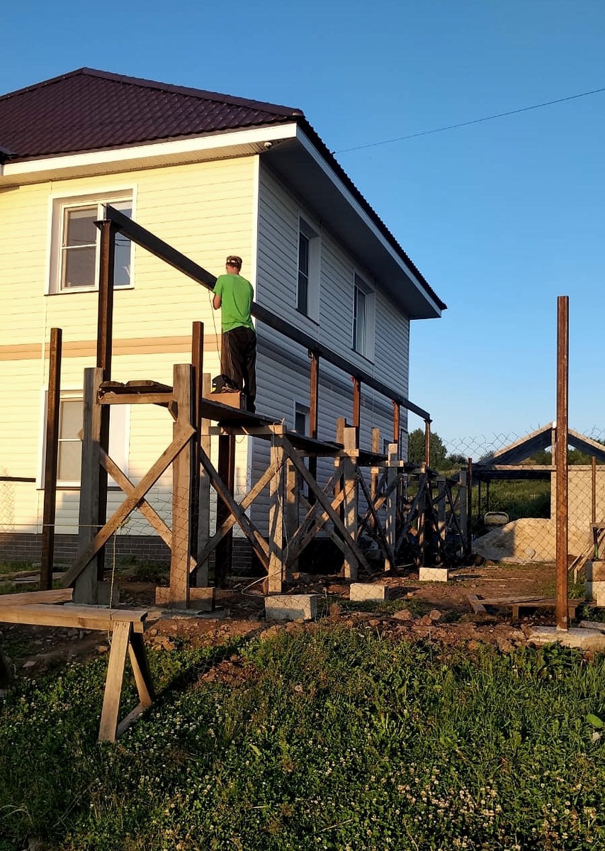 Все балки установлены и забетонированы 👍 построены леса и уложены швеллера. Теперь Женя сверху все пилит и варит. Эта конструкция нужна, чтобы сделать крытый двор.