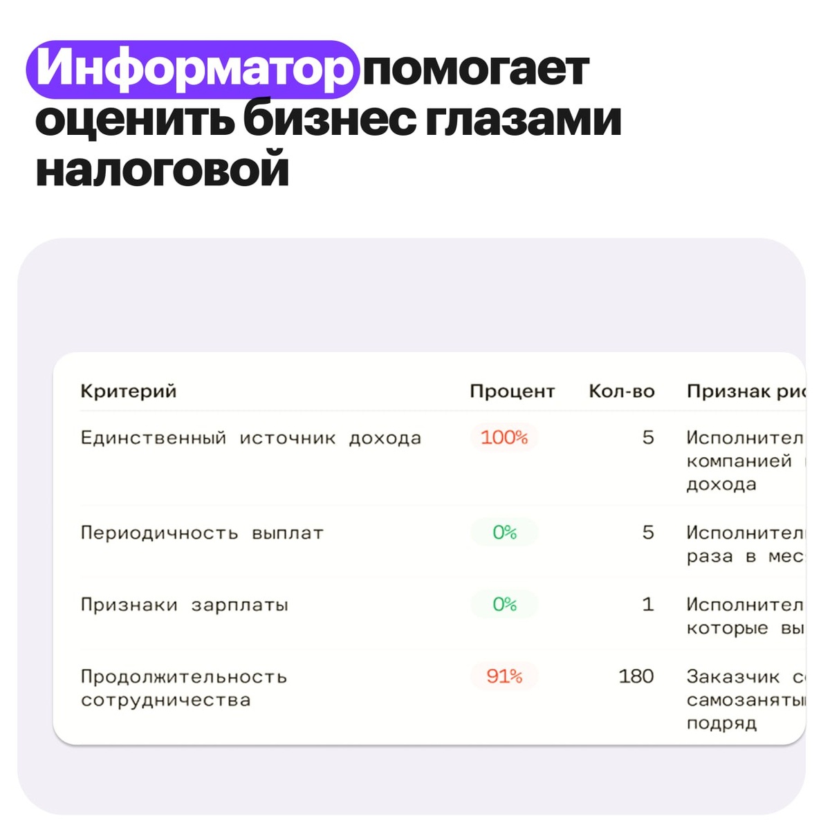 Что делать. Искать вручную — долго. Быстрее — с Информатором. Он помогает автоматически отслеживать риски. Модуль проверяет отношения с самозанятыми по 4 критериям: