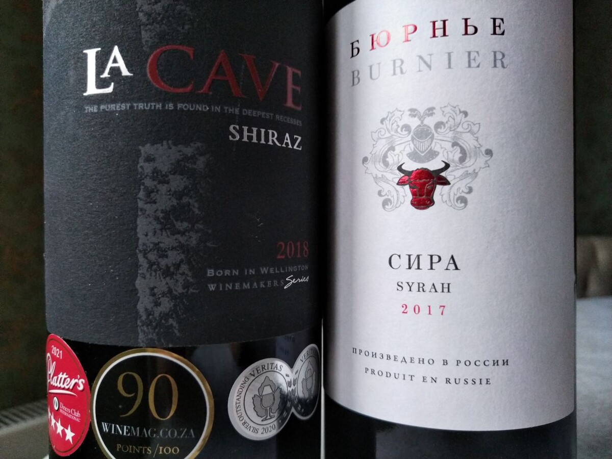Ожидал от сравнение проявления разных стилей. La Cave Shiraz Южноафриканский шираз урожая 2018 года, розлив май-2019. Продавался в "Ароматном Мире", я купил со скидкой на День Шираза, есть такой, за 1149 руб. вместо 2500. Сейчас, кажется, уже кончился. Еле открыл, пробка разваливалась. Фото чуть ниже. Ягодно-шоколадный, с преимуществом ягод, достаточно яркий аромат, новосветский такой. Весьма солидный и изящный, достаточно насыщенный. С аэрацией ягоды перестают перетягивать одеяло на себя, выступая теперь наравне с шоколадом и легкими пряностями. Чуть табака и - при фантазии - копчености. Вкус полный, немного пряный, тоже с ягодами и шоколадом. Большего развития нет, но и имеющегося вполне достаточно. Послевкусие весьма продолжительное. Баллов 89 легко и вполне заслуженно. Бюрнье Сира урожая 2017 года, розлив фев-2023. Когда-то АСТ долгое время продавал вина Бюрнье за полцены. Мне досталось за 2625 рублей. Нюхаешь, пробуешь - ах! Тут спору нет, что он лучше! Лёгкие и благородные нотки