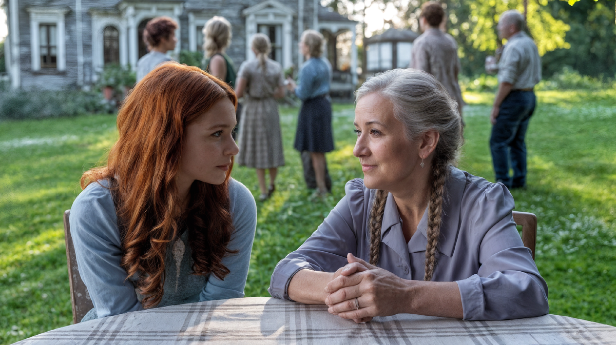 Час спустя такси остановилось у ворот дачного участка Елены Витальевны. Алла и Ирина, с тортом и букетом цветов, вошли во двор. Там царил хаос. Несколько машин стояли у забора, из дома доносились громкие голоса. На веранде Павел неумело нарезал овощи, а Ольга носилась с тарелками.