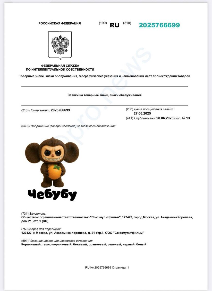 🧸"Союзмультфильм" регистрирует бренд "Чебубу