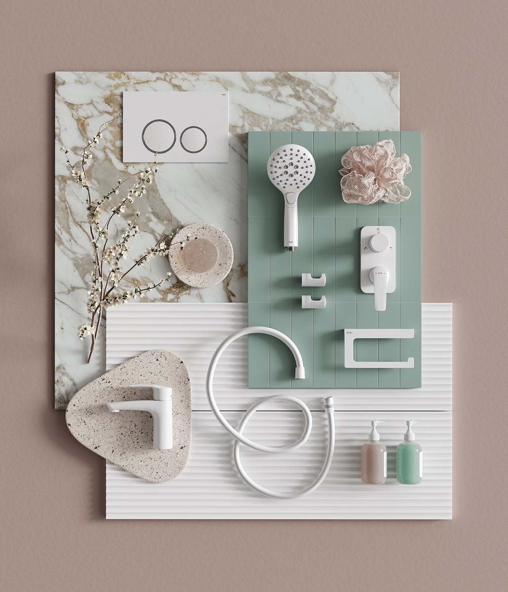 Сочетания сантехники и аксессуаров в матовом белом оттенке