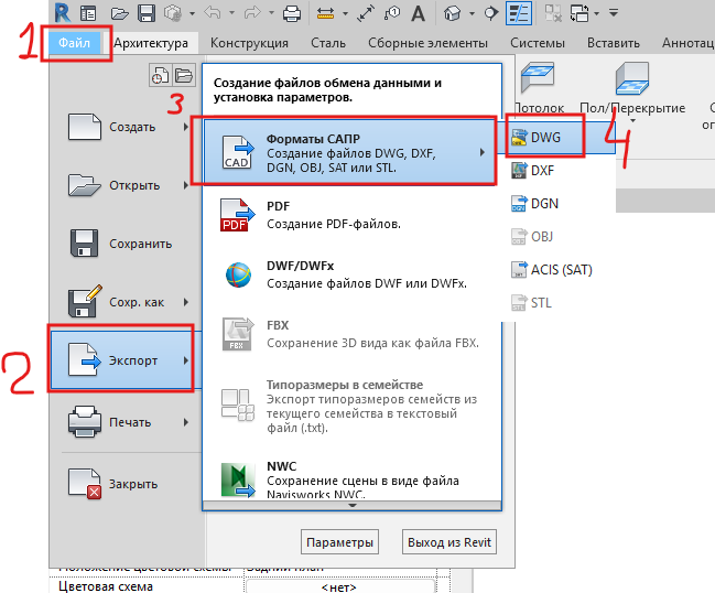 1) - Перейти в "Файл"(1) - "Экспорт"(2) - "Форматы САПР"(3) - "DWG"(4) 2) - Далее настроим параметры экспорта(1). При желании, можем создать наши параметры или воспользоваться дефолтными (2). Перейдем в "Цвет"(3) и обязательно нажмем "Задано в виде". Тогда Revit будет экспортировать те цвета, которые у нас на видах/планах/листах. Если нажмете другие настройки - то цвета будут меняться 3) Далее при необходимости создаем набор листов(1), чтобы в будущем его можно было экспортировать. Включаем в него необходимые листы(2) и жмем "Сохранить набор и закрыть"(3). 4) - Указываем папку, куда экспортировать dwg файлы (в моем случае - папка "Документы"). Далее указываем префикс, который появится у всех dwg файлов перед именем вида (обычно в префикс вписывают шифр объекта). Также рекомендую отключить галочку "Экспортировать вид