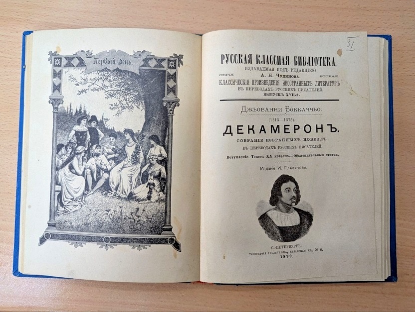 Передали в библиотеку и печатное издание «Русская классная библиотека». В сборнике представлены плоды трудов Франческо Петрарки, Джеймса Макферсона, Джованни Боккаччо с русским переводом. Издали его 1897–1899 годах в типографии Глазунова – одной из старейших в России.