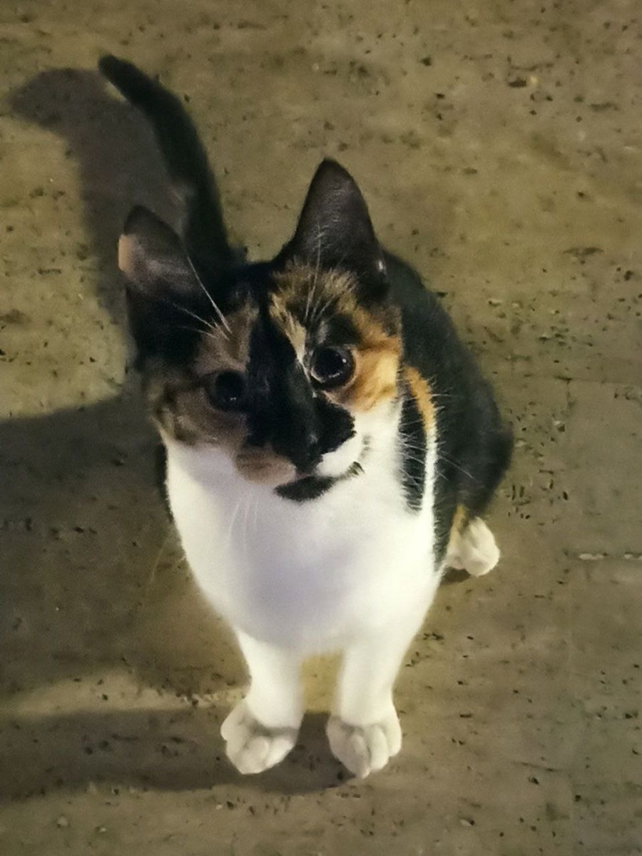 Ухо уловило шорох в кустах. Я обернулся. В тусклом свете разглядел два кошачьих силуэта: большой и маленький. Полез в сумку за паучами. Тихонько кыс-кыснул и выложил корм рядом с собой. Первым подошел крупный силуэт – им оказался статный, черно-белый, пушистый кот. Второй силуэт, что поменьше, неожиданно стал издавать бесконечный поток восторженных кряхтящих повизгиваний (долго подбирал слова, чтобы описать сей инопланетный язык). То была котенок-девочка, трёхцветка, месяца четыре. Когда её старший товарищ начал довольно уплетать явно вкусный ужин, она остро стремилась к нему присоединиться. Но боялась. Быстро-быстро приближалась, безудержно и звонко бормоча, потом в той же манере отдалялась. Такое «и хочется, и колется» на ускоренной перемотке. Смешная.