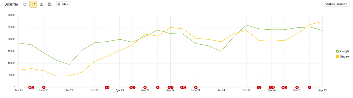 Разбираемся, как правильная работа с контентом, юзабилити и точечная оптимизация дали кратный рост органического трафика. Сложная ниша и ограничения по семантике Компания Testslab проводит химические и экологические исследования воды, воздуха, почвы, а также занимается разработкой нормативно-правовой документации. Это высококонкурентная ниша с узкопрофильными услугами и сложной терминологией. С i-Media клиент работает уже более 10 лет. В 2023–2025 годах мы сфокусировались на обновлении сайта. Задачи ставились в соответствии с актуальными требованиями к контенту, юзабилити и техническому состоянию. Такой подход позволил достичь кратного роста органического трафика. Рост органического трафика на сайте за 2 года с апреля 2023 по апрель 2025 Техническая и внутренняя оптимизация Работа с технической и внутренней оптимизацией непрерывно ведется в течение всего времени сотрудничества. Регулярно производим парсинг сайта, чтобы выявить и затем устранить ошибки, мешающие индексации. Особое внима