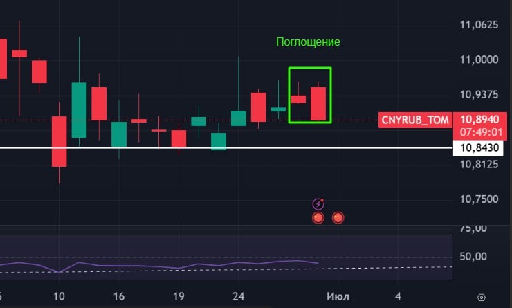 В ответ на пост 🔤 Юань-Рубль: обновление! 🟢 На дневке нарисовалось медвежье поглощение. Следим за треугольником, который я рисовал ранее - реакция на него в любой форме подтвердит его существование. 🟢 Если при пробое вниз возникнет импульс, то высока вероятность пробоя 10,84 вниз. Сегодня, кстати, последний день оплаты налогов экспортерами. Но дело, как мне кажется, не в давлении сверху, а в отсутствии покупательской силы. #юаньрубль #прогнозрубля #юань #рубльдоллар #CNY #CNYRUBF #CNYRUB #bogdanoffinvest