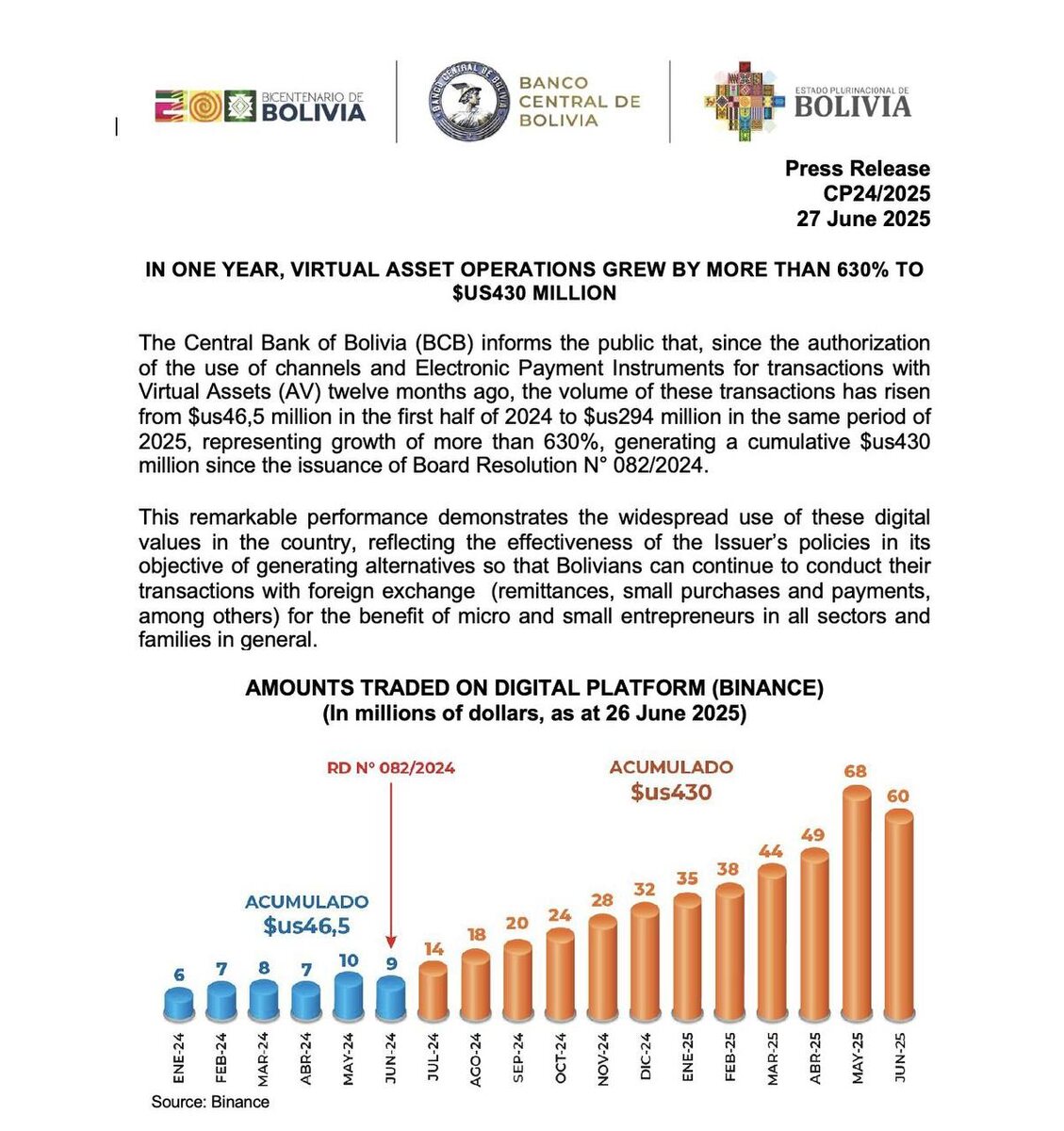 Центробанк Боливии официально отчитался: крипта выросла на 630% за год Объём операций с цифровыми активами за год вырос с $46.5 млн до $294 млн только за первое полугодие 2025. Всего — $430 млн с момента разрешения (июнь 2024). Что это значит? 1. Легализация = масштаб Как только дали зелёный свет на Binance и переводы в USDT — объёмы пошли в рост. Люди начали массово использовать крипту для реальных задач: переводы, оплата, расчёты между предпринимателями. 2. Микроэкономика первой адаптируется Цифровые активы — не про спекуляцию. Это про выживание. Особенно в странах, где банковская система слабая, а валюта нестабильна. 3. Центробанки начали считать BCB публикует отчёт не для красоты. Это сигнал: — мы следим, — мы регулируем, — мы интегрируем. Теперь представьте, что произойдёт, когда такие отчёты начнут выходить из Аргентины, Египта, Нигерии. А потом — Индии. Крипта перестаёт быть нишей. Она становится инфраструктурой для выживания. И да, это уже не тренд. Это сдвиг парадигмы.