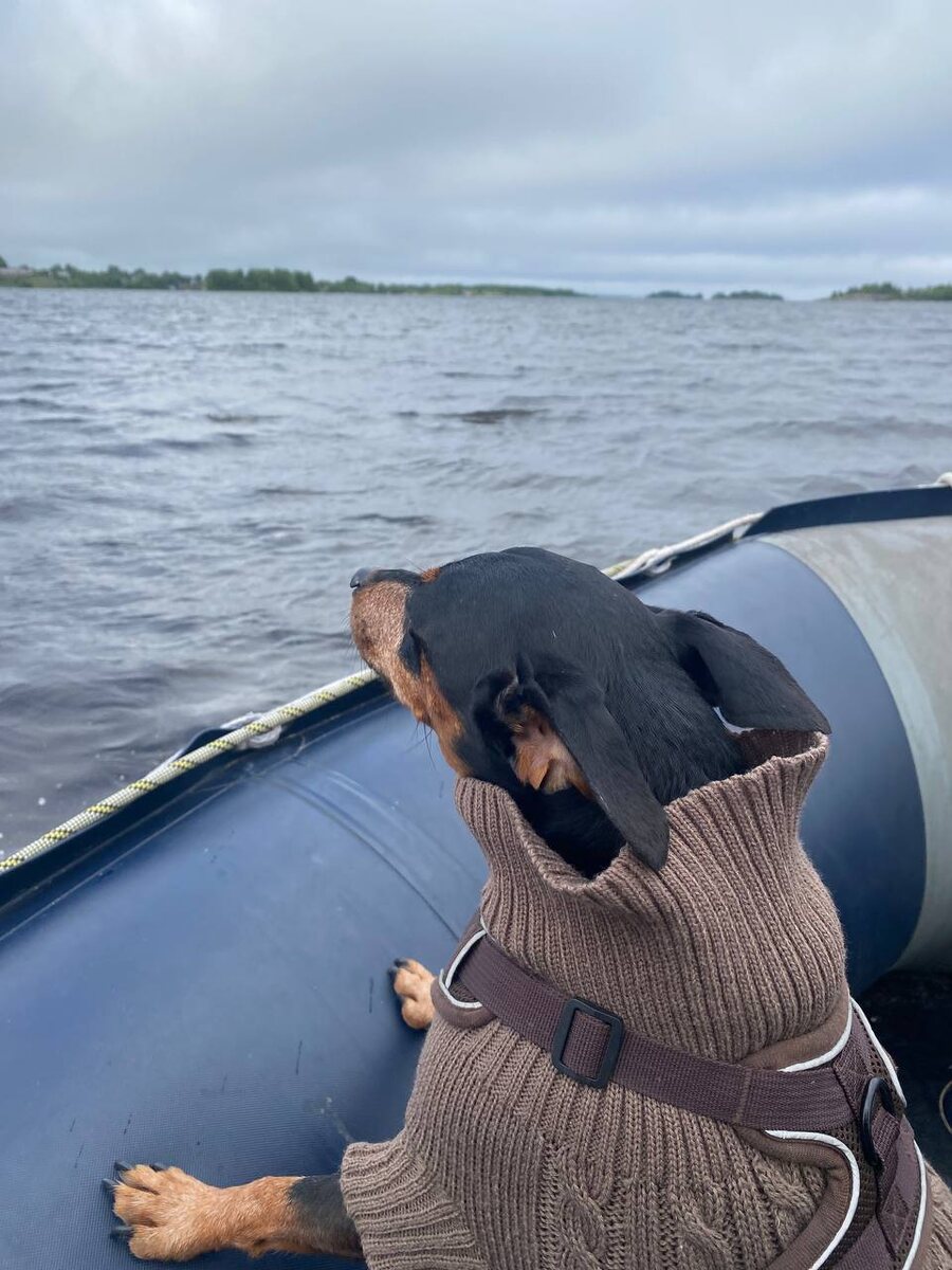 Однажды, холодным июньским вечером, муж, внучка и я, решили поехать на острова за грибами. А что? Река-море рядом, острова тоже, 15 минут до ближайшего острова по реке и мы у цели. Грибы, которые растут на суше мы собирать не любим, а вот те, что посреди воды, на островах, обожаем, они экологически чистые. И вот мы, три авантюриста одной крови, погнали в шесть часов вечера за грибами. Ветер, на термометре +8, но мы тепло оделись. Ночи в Карелии белые. Собачка наша впереди всей команды в лодке сидела. Добрались нормально. Договорились искать грибы по разным сторонам острова, муж направо, мы с внучкой и собачкой, налево. Ветра не было в лесу на нашей стороне, грибов тоже не было, зато комары напали организованно. На пеньке росла вот такая прелесть. И вдруг, стал подниматься густой туман. Решили срочно возвращаться, в тумане не хотелось крутиться. С грибами повезло только мужу. Червей нет, грибочки крепкие. Вот наша добыча. Стали снова загружаться в лодку, Тайрон, естественно, решил на