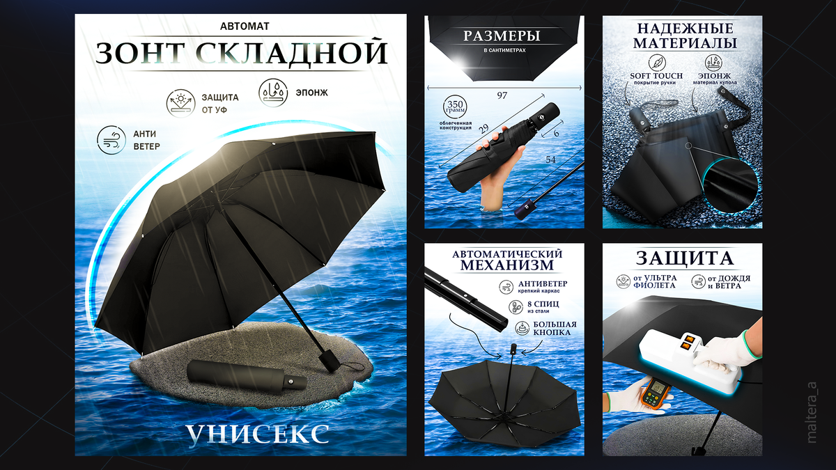 В основе моего решения лежала простая, но мощная идея: товар должен быть представлен в среде своего максимального использования. Однако я пошла дальше — вместо простого отражения реальности, я усилила ее до уровня визуальной метафоры. Это не просто зонт под дождем — это символ защиты, единственное спасение в мире, где все вокруг залито водой.