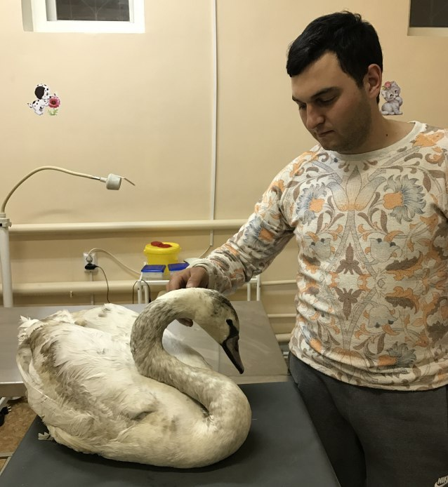 Необычной находкой закончилась для жителя Липецка Михаила Маркосяна прогулка по берегу водохранилища: молодой человек увидел лебедя, попавшего в хомут. – Я подумал сначала, что это дикий гусь, но тот бы улетел, – поясняет Михаил. – А так он не смог убежать, и я взял его в руки. Снять хомут самостоятельно не получилось, боялся повредить шею, поэтому позвонил знакомому ветеринару и отвез птицу в клинику. Врачи осмотрели лебедя, из-за повреждений на шее у него была температура. Птице вкололи необходимое лекарство, но сказали, что, если сейчас ее отпустить, то она может не выжить, и разрешили Михаилу забрать лебедя домой до полного выздоровления.