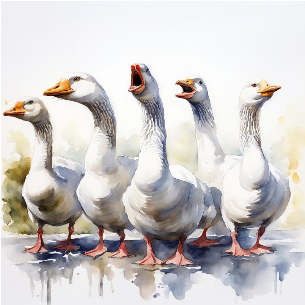 Начнем с такой вот замечательной акварели. Пять прекрасных гусей вышли на прогулку. Что тут можно сказать?