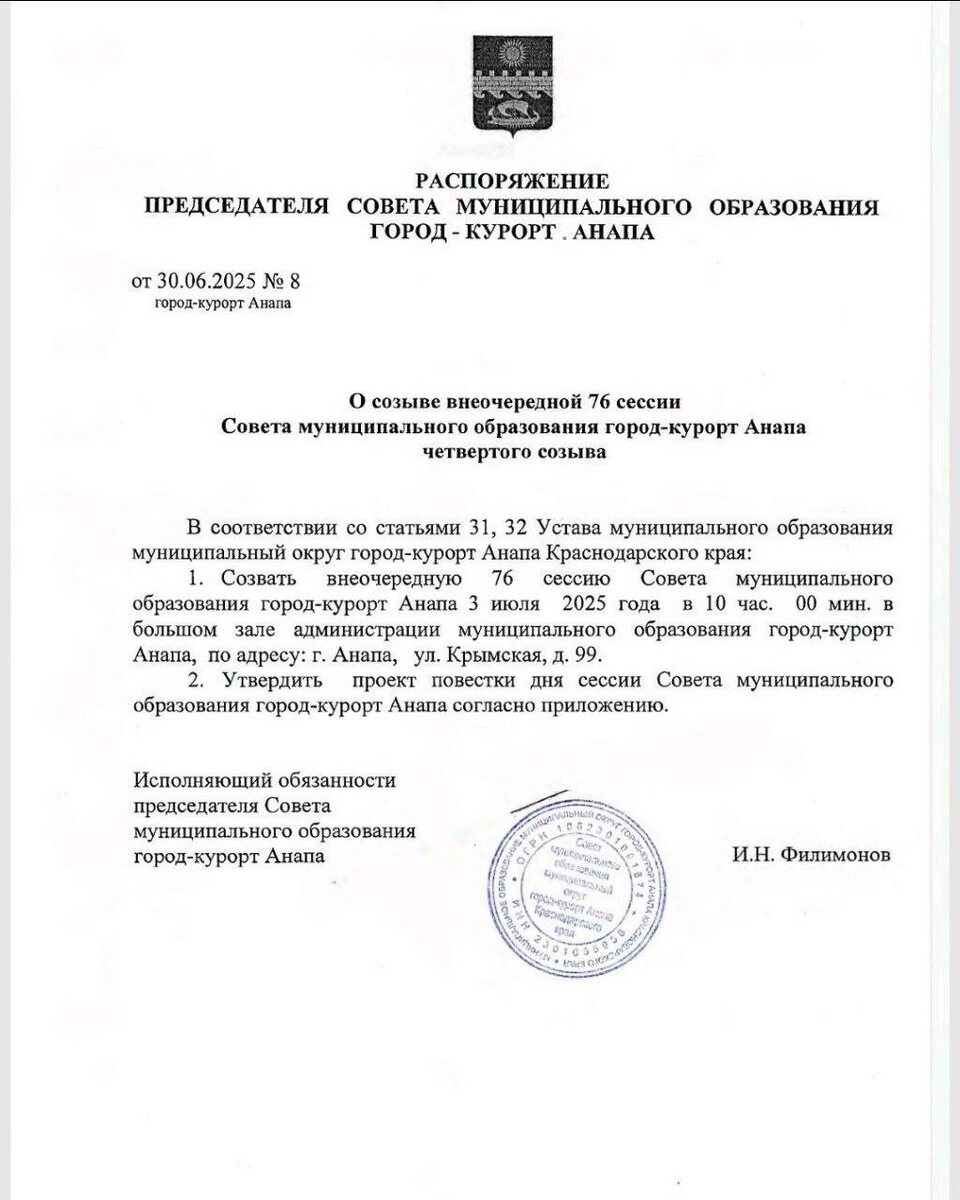 3 июля Совет города-курорта назначит конкурс по отбору кандидатур на должность главы города-курорта Анапа В соответствии со ст. 35 Устава муниципального образования муниципальный округ город-курорт Анапа, кандидатом на должность главы города-курорта Анапа может быть зарегистрирован гражданин, который на день проведения конкурса не имеет в соответствии с Федеральным законом от 12.06.2002 № 67-ФЗ «Об основных гарантиях избирательных прав и права на участие в референдуме граждан Российской Федерации» ограничений пассивного избирательного права для избрания выборным должностным лицом местного самоуправления. Главой города-курорта Анапа может быть избран гражданин Российской Федерации, достигший возраста 21 года. В соответствии с п. 4 ст. 37 Устава, в случае досрочного прекращения полномочий главы города-курорта Анапа избрание главы города-курорта Анапа, избираемого Советом из числа кандидатов, представленных конкурсной комиссией по результатам конкурса