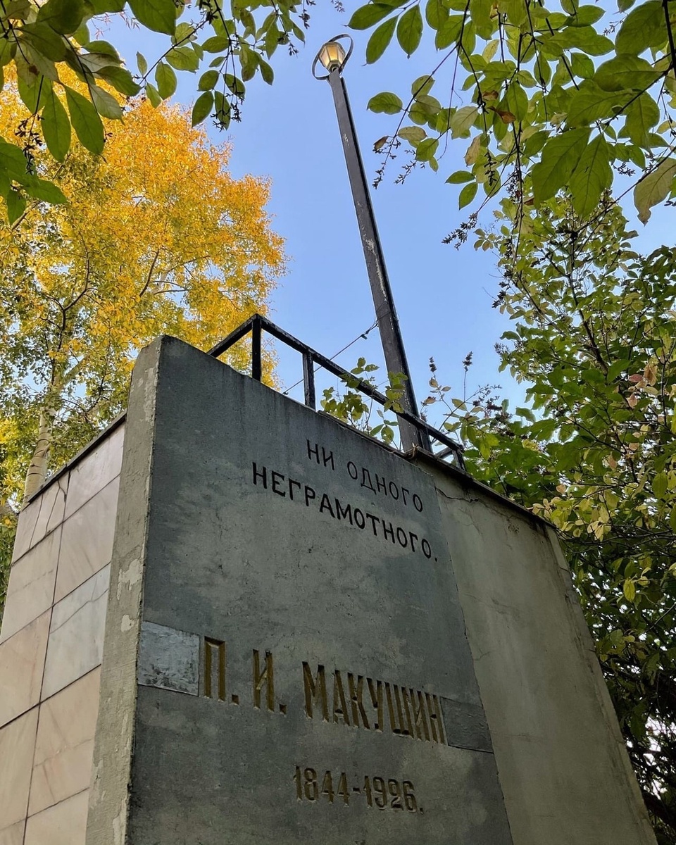 Томск Могила Петра Макушина — томского книгоиздателя и торговца, открывшего в губернии с 1910 по 1915 год 350 (!) библиотек. По его завещанию после смерти было установлено одно из самых необычных надгробий России — электрическая лампочка на верхушке рельса и надпись «Ни одного неграмотного».