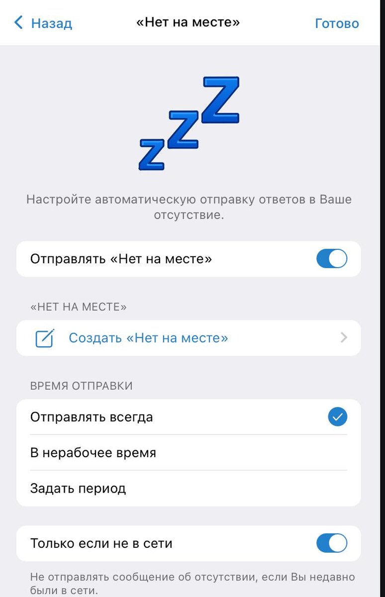Автоматическое уведомление «Нет на месте». Настройки → Уведомления и звуки → Автоответчик. Включите функцию и задайте текст: «Спасибо за сообщение! Сейчас я вне офиса, отвечу вам завтра с 10:00 до 18:00».