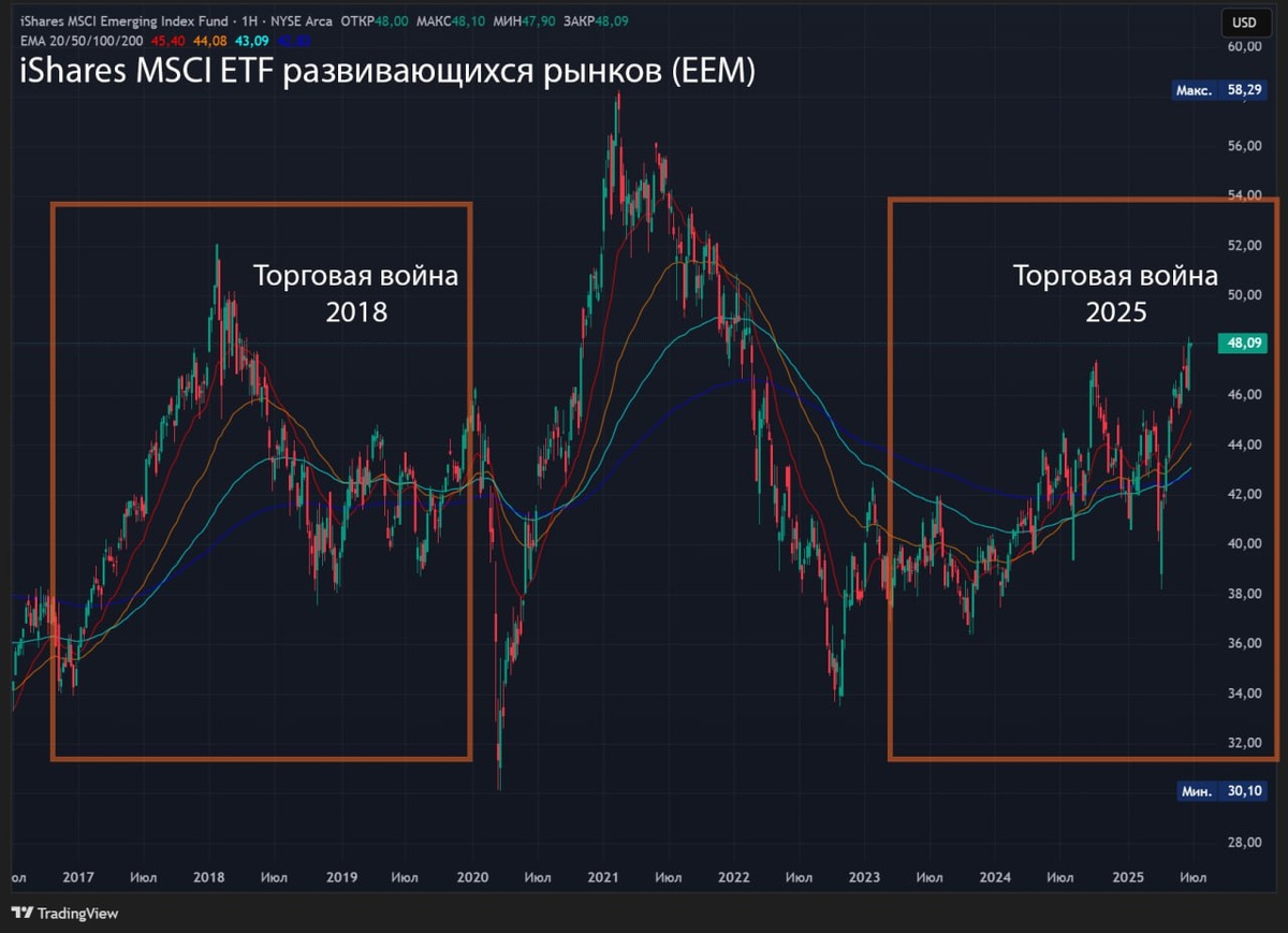 В поисках тарифной логики Важно зафиксировать ключевой момент: с момента объявления паузы в апреле команда Трампа последние 3 месяца трансформировала политику тарифов с «взаимных» [Reciprocal, основанные на торговых дисбалансах с конкретными ставками для разных стран] на «унилатеральные» [Unilateral = односторонние ограничения или переход от попыток переговоров к прямому наложению тарифов]. Все анонсированные переговоры и хрупкие сделки фактически сосредоточены на развитых странах [DM+Китай]. При этом основным фактором, подавляющим торговлю США, является иностранные зарплаты, а не тарифы на импорт из Америки. И думается в администрации это хорошо понимают, что объясняло бы полное отсутствие интереса к переговорам о «нулевых тарифах» с EM и сосредоточению на торговых барьеров с DM. Именно поэтому сильнейший удар от торговый войны, если тарифы вступят в силу к 9 июля, в первую очередь, придется именно на развивающиеся рынки [EM, с особым фокусом на азиатский регион]: администрация рас