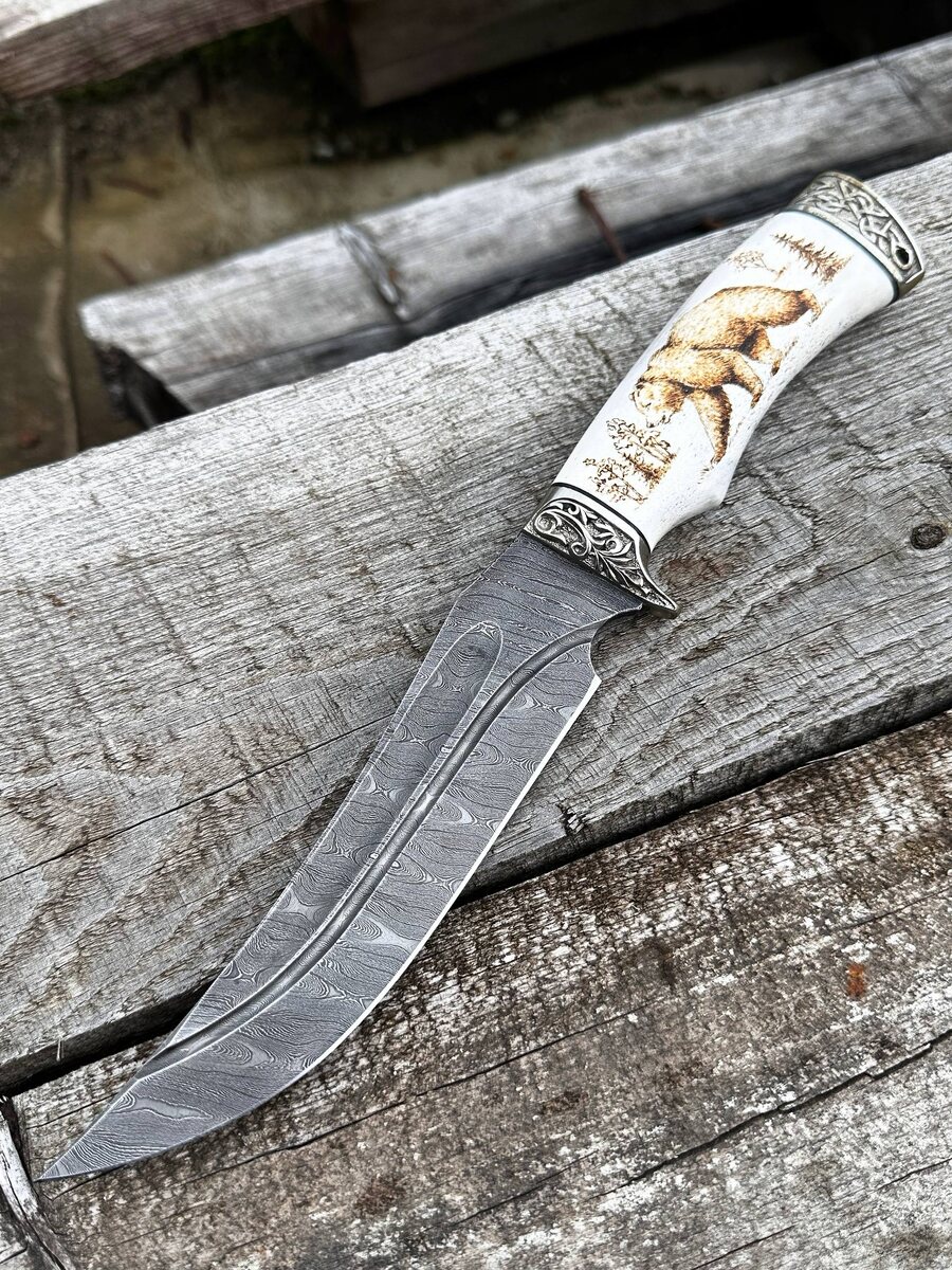 Готов большой рабочий нож «Легионер». Нож выполнен из дамасской стали в 950 слоев с фигурными долом на клинке и фрезерованным долом на клинке. Нож отлично подойдет для рубки, разделки, строгания и в качестве подарка. Сталь прочная на излом и долго держит заточку. Рукоять на ноже выполнена из рога лося с пирографией с двух сторон. Гарда травмобезопасная из мельхиора. Нож заточен в бритву. Твердость каждого клинка (HRC): 62 Цена за нож: 34.330 рублей. В комплекте идут ножны из натуральной кожи. Можем сделать формованные ножны +8000 рублей. Для заказа писать на @Nazarklinokbot или по тел +79101343831 WhatsApp/Viber
