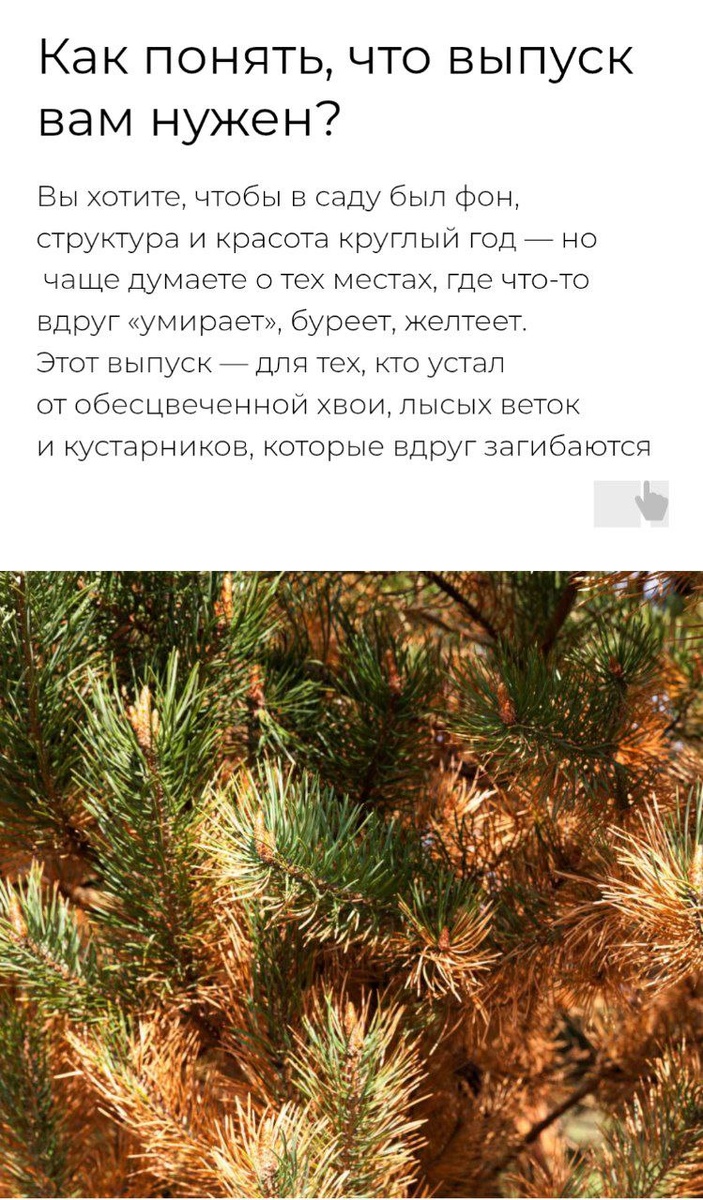 Сегодня — последний день, когда можно получить выпуск про хвойные Мы часто выбираем хвойные, как опору. Чтобы зелень была круглый год. Чтобы что-то держало форму. Чтобы с ними было «проще». А потом... они выгорают. Желтеют. Вытягиваются в крону, похожую на веник. Или просто загибаются — будто не нашли себе места. Так у многих. Потому что хвойные действительно не про «посадил и забыл». Они про точность. Про свет. Про воду. Про посадку в нужное место, а не «куда осталось». 🟢 В июньском выпуске «Учебника» мы собрали всё, что важно знать, чтобы хвойные стали украшением сада — а не поводом для переживаний: — почему хвоя буреет или осыпается (и как понять, это болезнь или норма); — что делать, если куст «потерял лицо» — вытянулся, перекосился, стал лысым; — как обрезать без страха (даже ели и сосны — можно, если правильно); — как выбрать здоровый саженец и не ошибиться с местом; — как сделать красивую композицию, а не просто «посадить в ряд». 🎥 Внутри — лекции, схемы, список сортов,