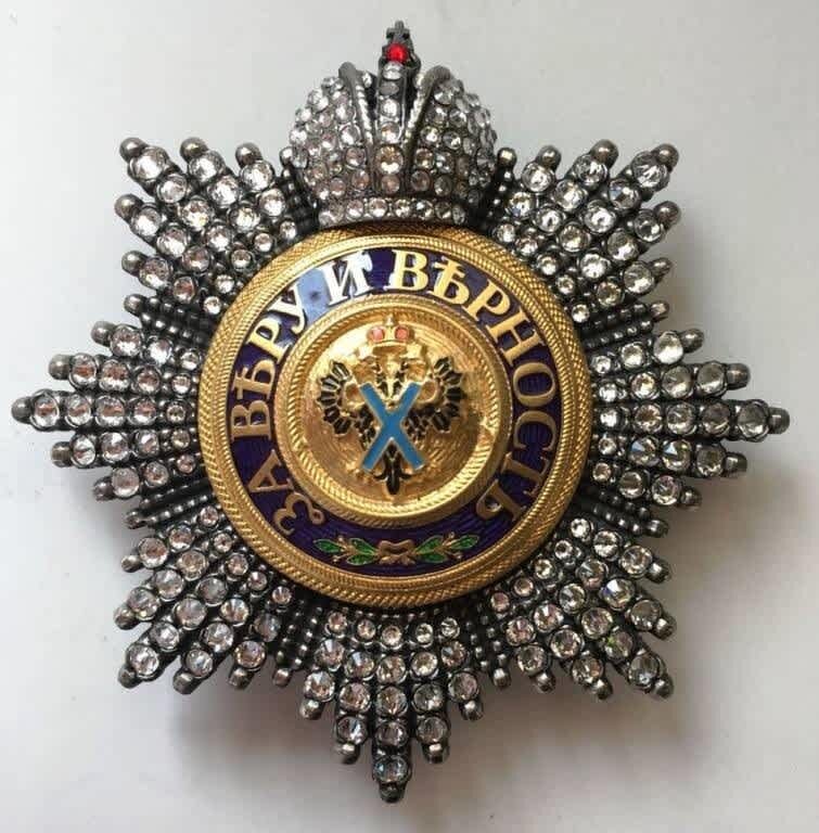 Наградная система Российской империи берёт своё начало с учреждения Петром I ордена Святого апостола Андрея Первозванного 10 декабря 1698 года (по другим данным — 30 августа того же года). Решение о создании ордена было принято после возвращения царя из Великого посольства в Европу, где он осознал необходимость официальной наградной системы. Отсутствие собственных орденов ставило русских дипломатов в неловкое положение на европейской арене. 1 июля 1998 года указом президента Бориса Ельцина орден был восстановлен как высшая государственная награда Российской Федерации, завершив трёхвековую историю прерванной традиции. Знак ордена представляет собой косой (андреевский) крест голубого цвета с изображением распятого святого Андрея. На четырёх концах креста расположены латинские буквы «S.A.P.R.» — «Sanctus Andreus Patronus Russiae» («Святой Андрей покровитель России»). Орден дополняется серебряной звездой с девизом «За веру и верность», которую носят на левой стороне груди выше всех остальн