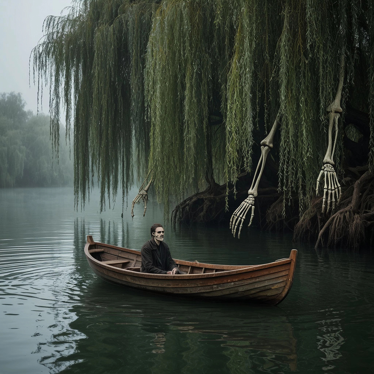 Потом из-под чёрной, жирной земли, протыкая её, как страшные ростки, стали появляться они. Сначала кончики пальцев — белые, чистые, будто вываренные. Затем целые кисти, запястья. Скелеты. Они вылезали из-под корней ив, отряхиваясь от комьев земли. Движения их были неровными, дёргаными, как у марионеток. Пустые глазницы их черепов были обращены ко мне. Они не бежали. Они шли. Медленно, со всех сторон, окружая меня.
