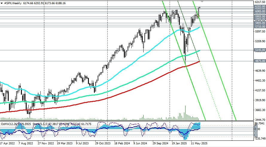 https://basechop.ru/wordpress/?p=48629 Пока что текущие фундаментальные факторы создают попутный ветер для американского фондового рынка, чьи индексы продолжают расти, отметили мы в нашем недавнем обзоре. Наш предыдущий прогноз (вход в длинные позиции возможен как «по-рынку», так и при откатах к зоне поддержки вблизи уровней 6050.00, 6032.00, 6000.00) полностью подтвердился. Американский индекс широкого рынка S&P500 сегодня обновил рекордный максимум, поднявшись к отметке 6202.00 в ходе азиатской торговой сессии. На момент же публикации данной статьи, фючерсы S&P500 торговались вблизи отметки 6186.00. Несмотря на снижение в первой половине сегодняшней европейской торговой сессии, с технической точки зрения, фьючерсы на индекс широкого рынка S&P500 (в торговом терминале отражаются как #SPX) торгуются в зоне долгосрочного и глобального бычьего рынка, выше ключевых долгосрочных уровней поддержки 5145.00 (ЕМА144 на недельном графике), 4875.00 (ЕМА200 на недельном графике). Глубокая…