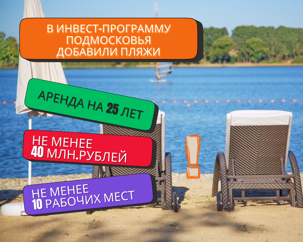 В программу МАИП в Подмосковье добавили пляжи. 🔥 Хорошая и долгожданная новость для индустрии туризма и отдыха Московского региона - в программу Масштабных инвестиционных проектов, реализуемых по 272 постановлению добавили пляжи!!! 🔥Новость! В Московской области планируют развивать пляжи за счет частных инвесторов: предприниматель может получить земельный участок в аренду без торгов на 25 лет для организации отдыха на воде под обязательство инвестировать не менее 40 млн.рублей и создания не менее 10 рабочих мест. 🔥 Никаких ограничений по выбору концепции и реализации инвестпроекта - есть где проявить креатив. 🔥Но участок нельзя будет выкупить в собственность. Но за 25 лет эксплуатации организованного места отдыха у воды можно с лихвой вернуть все затраты. 🤝 Кто заинтересовался - необходимо поторопиться. Количество «диких» мест под будущее освоение ограничено. Теперь можно купить собственный пляж! Обращайтесь, обдумаем и решим вместе как это сделать! #инвестиции #недвижимость #фли