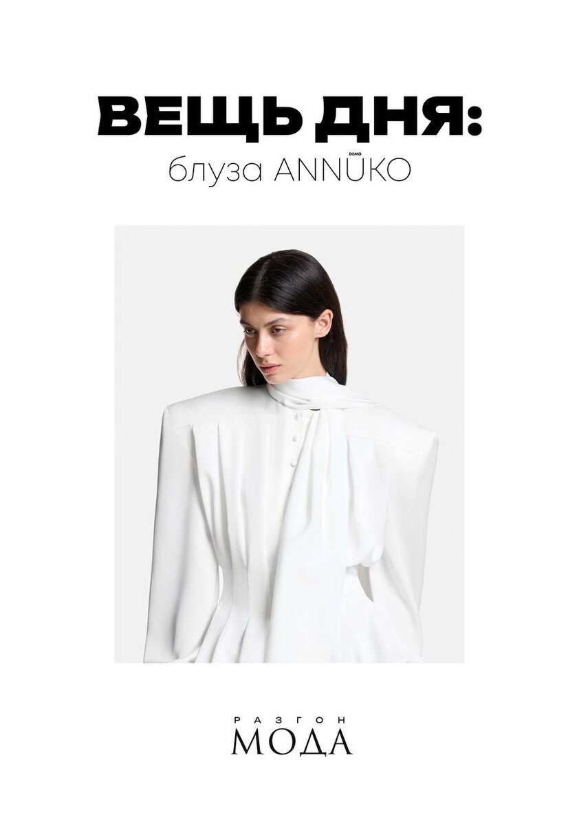Мы нашли идеальный пример того, как классический силуэт внезапно приобретает другой смысл через детали. Приталенный крой блузы ANNÚKO с мягкими складками подчеркивает талию, а длинные ленты и высокая стойка добавляют образу утончённой графичности. Обтяжные пуговицы и возможность регулировки манжет делают вещь ещё более универсальной и удобной в носке. Такая блуза идеально впишется как в вечерний наряд, так и в повседневный комплект с денимом. #РазгонМода_ВещьДня