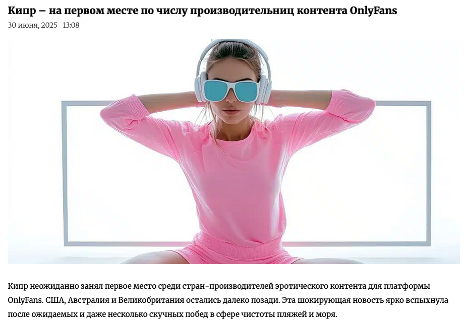 Шоб вы знали, каждая двадцать пятая чудачка в Кипре делает деньги, делая контент на взрослых в одной известной платформе. И такие страны, как США, Австралия и Великобритания мелко плавают рядом с кипрскими лялечками по количеству на душу женского населения. Говорят, шмары со всего мира взяли билет на остров через низкие налоги и шикарную погоду. И самые лучшие теперь делают по сто штук денег в год, что в три раза больше, чем средний житель Кипра. Не имею делать морду, что осуждаю — каждый сам себе гешефтмахер, и всё же делаю прогноз за повышение цен на недвижимость, особенно с шикарным видом, где можно пилить контент.