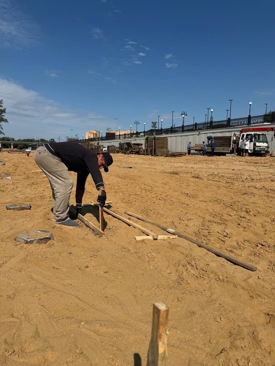 В Оренбурге пляж у памп-трека обустраивает ООО «Новый век»: завезён и разровняли песок, устанавливаются забор, 30 лежаков с навесами