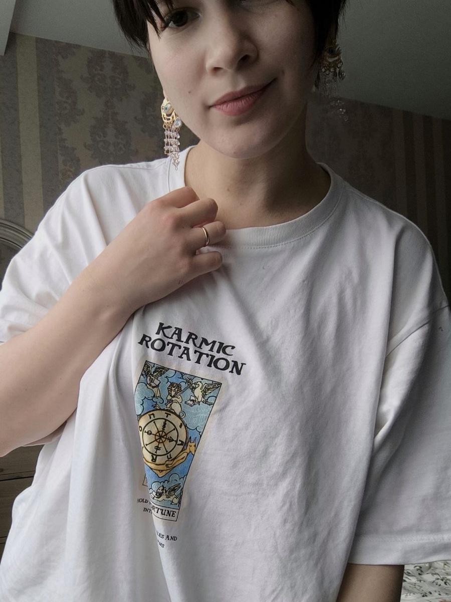 Обычный дождливый день дома. Надеть пижамные штаны, футболку с моим любимым арканом Таро и добавить сюда большие серьги - мой способ сделать расслабленный выходной стильным 🌟