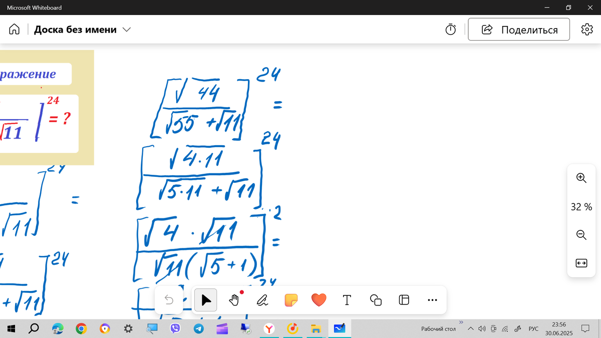 Упростите и вычислите без калькулятора выражение: [√44/(√55 + √11)]^24