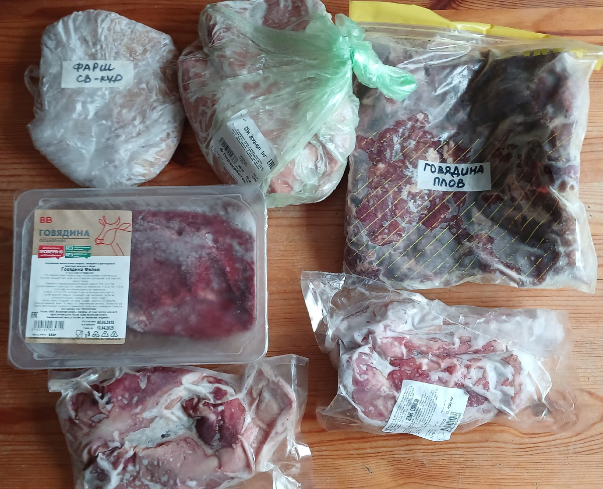Мясо: говядина филей, говядина кусочками, эскалопы свиные, порция фарша свинина-курица домашнего, языки свиные