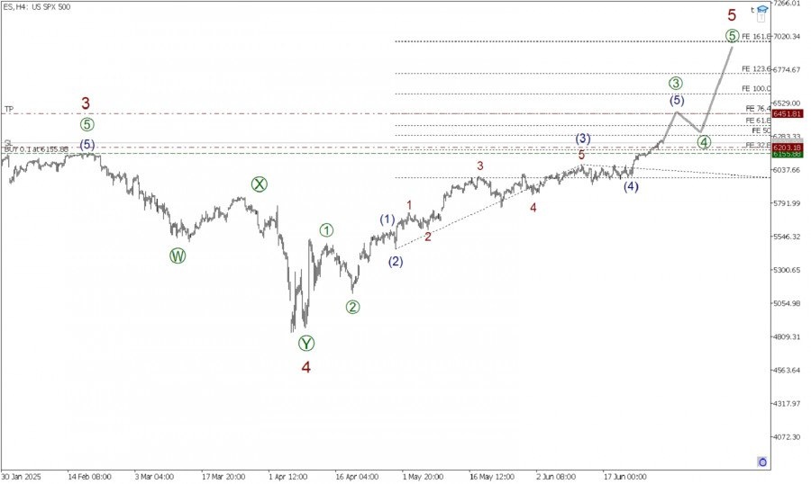 Волна 5 может принять форму импульса [1]-[2]-[3]-[4]-[5]. Завершены подволны [1]-[2], и сейчас растем в более мощной подволне [3]. Вероятно, быки нацелены на предыдущий максимум 6451.81, который отмечен импульсом 3.