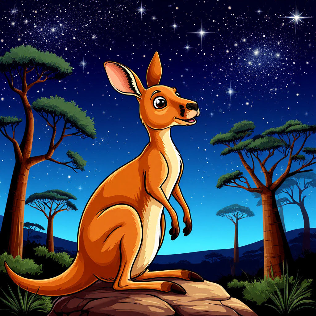 В жаркой саванне, где росли стойкие баобабы, жил любопытный кенгурёнок Кенги. Однажды он спросил у мамы: – А мы можем допрыгнуть до звёзд? – Не думаю. Ведь звёзды рождаются внутри нас! Это доброта, честность и храбрость! И каждый должен найти свой звёздный путь! Кенги вспомнил, что в соседней долине растёт волшебный эвкалипт, исполняющей желания. А у Кенги была мечта – допрыгнуть до звёзд, и поэтому он отправился в путь. Долго Кенги прыгал по саванне, ища путь и сердясь на себя, что невнимательно слушал маму. Ему встретилась одинокая лама Эва: – У меня нет друзей. Ты будешь моим другом! – Конечно. А ты знаешь, где растёт волшебный эвкалипт? Лама радостно захлопала ушами: – Да, ведь я живу рядом с ним! Он за теми скалами. Побежали и попрыгали! Эва оказалась болтливой и весёлой ламой, которая неуклюже прыгала. То не доскочит, то прыгнет мимо. Двигались они медленно. Кенгурёнок помогал как мог и удивлялся: – Да что с тобой? – Такая родилась! Я хотела загадать желание, но мама сказала, чт