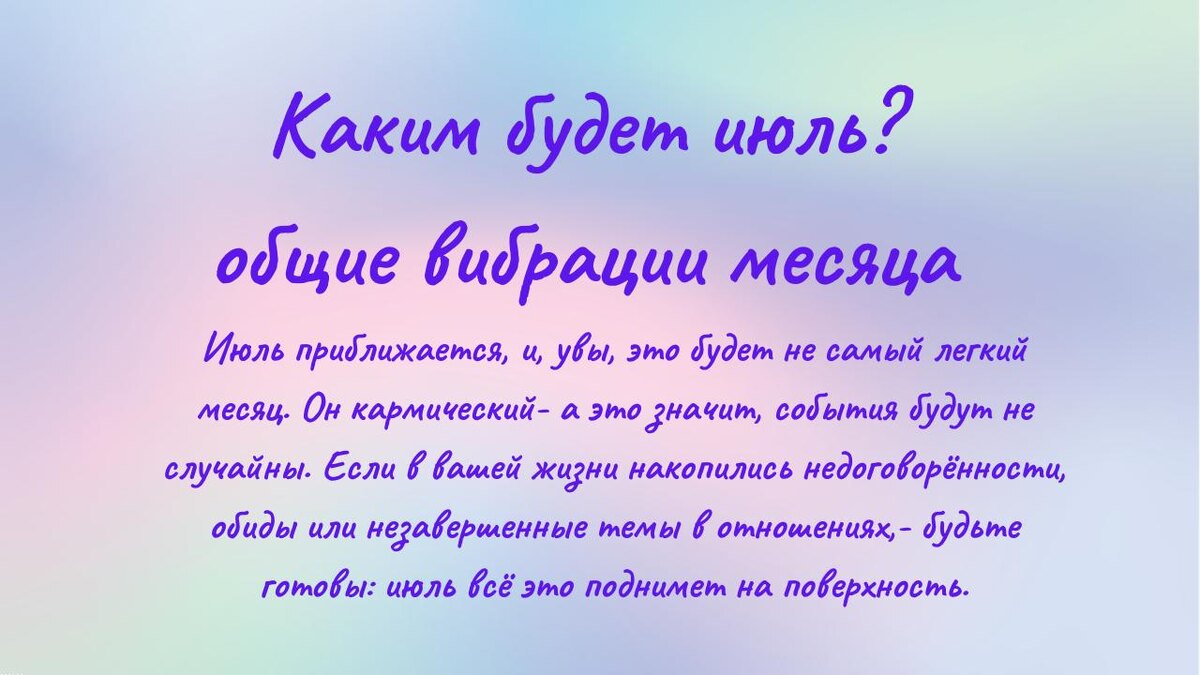 🔮Июль 2025: кармический месяц. Сумма месяца (7) и года (2025 = 9) = 16 — одно из самых непростых и «кармически острых» чисел. Энергия 16 — это когда рушатся иллюзии, а маски спадают, проверка на прочность. Особенно — в сфере близких отношений. 📍Что это может означать на практике: — конфликты с партнёром, детьми или родителями — ситуация, когда вскрываются старые обиды — окончание неискренних или токсичных связей Если чувствуете, что ваша жизнь сейчас на «развилке» — будьте особенно осознанны. Месяц будет подталкивать к важным решениям и обострять то, что давно просилось наружу. ✨ Но есть и вторая сторона. Июль под вибрацией семёрки — а это всегда про: — внутренние инсайты — духовный рост — активацию интуиции — глубокие процессы очищения ❗Но возможны и трудности: — ощущение одиночества — сомнения в себе — ощущение «энергетической просадки» — желание закрыться от мира 💬 Главное — не сопротивляйтесь. 16 учит нас принимать перемены и видеть за разрушением новые смыслы.