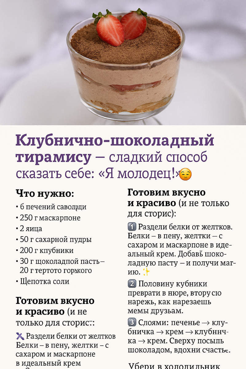 🍓 Клубнично-шоколадный тирамису — сладкий способ сказать себе: «Я молодец!» 😌🍫 🛒 Что нужно: 6 печений савоярди (или любые «бисквитные обломки мечты») 250 г маскарпоне — нежность в банке 2 яйца (желательно не перепелиные, всё-таки десерт серьёзный) 50 г сахарной пудры 200 г клубники — потому что просто хочется 30 г шоколадной пасты — Nutella, привет! 20 г тёртого шоколада — можно сразу в рот, но лучше в крем Щепотка соли — чтобы жизнь не казалась совсем сахарной --- 👩🍳 Готовим вкусно и красиво (и не только для сторис): 1️⃣ Отдели белки от желтков. Белки — в пену, желтки — с сахаром и маскарпоне в идеальный крем. Добавь шоколадную пасту — и получи магию. ✨ 2️⃣ Половину клубники преврати в пюре, вторую нарежь, как нарезаешь мемы друзьям. 3️⃣ Слоями: печенье → клубничка → крем → клубничка → крем. Сверху посыпь шоколадом, вдохни счастье. 4️⃣ Убери в холодильник на час. За это время ты можешь: – выложить фото заготовки в канал – открыть 3 сериала – съесть половину ло