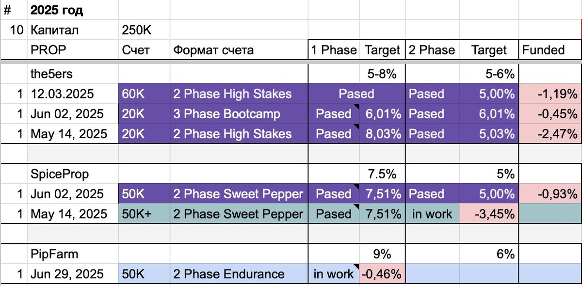Итоги за #Июнь 2025, текущий прогресс и ситуация по проп счетам #Статистика За Июнь было получено два funded счета на 20К и на 50К, с 20-ки был небольшой вывод профита, в остальном пока все в просадке как видно по таблице. Взял еще челендж на PipFarm на 50К